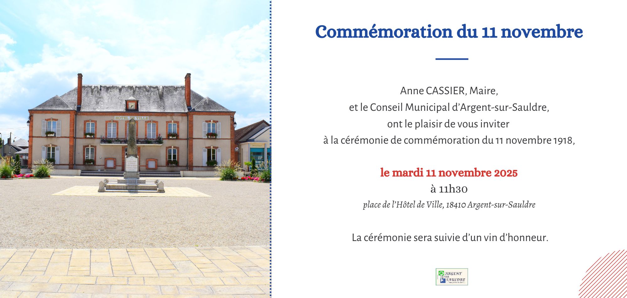 La cérémonie de commémoration se déroulera le mardi 11 novembre 2025 à 11h30 sur la place de l'Hôtel de Ville.