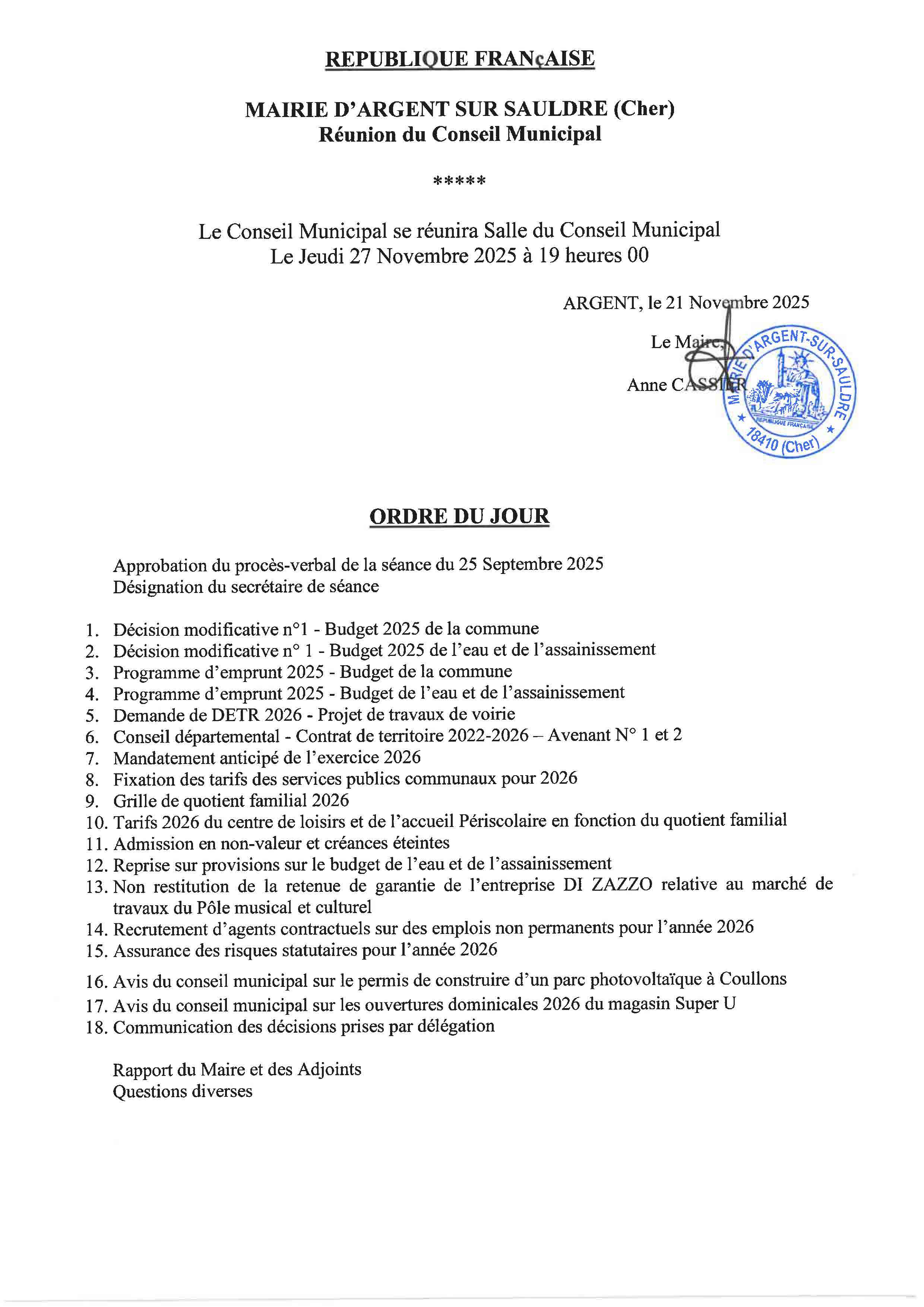 Le Conseil Municipal se réunira le jeudi 27 novembre 2025 à 19h00 en salle du conseil.
